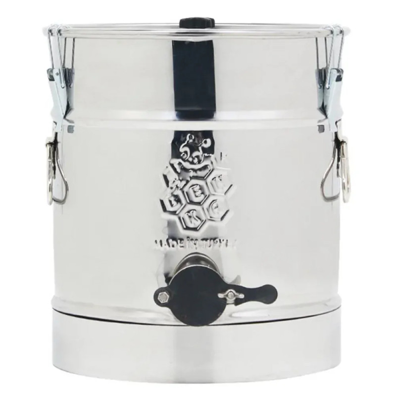 Stáčacia nádoba na 30kg medu. Materiál : nerezová oceľ AISI 304 Ventil : nerezová oceľ AISI 304 Poklop : nerezová oceľ AISI 304 s tesnením. Na nádobe sa nachádzajú spony na uzavretie, držiaky po stranách na prenášanie.